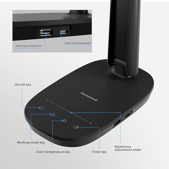 - 【Intelligent Touch for All Convenient 】 The smart touch reading light features a touch-sensitive panel design.Switch brightness levels and lighting modes at the touch of a button with a simple swipe of your finger.Honeywell H2 office desk lamp is equipped with a professional work lighting mode, providing convenient lighting for your work and office life. The 30-minute auto timer and memory function make your lighting choices smarter and more convenient.