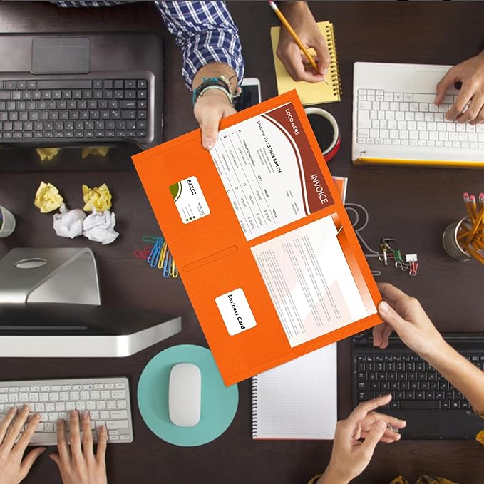 - TWO POCKET FOLDER SET: 50 Pack orange paper folders with 2 inner pocket and 2 business card slots. Deep pocket design can provide secure storage space for papers, files or other important materials