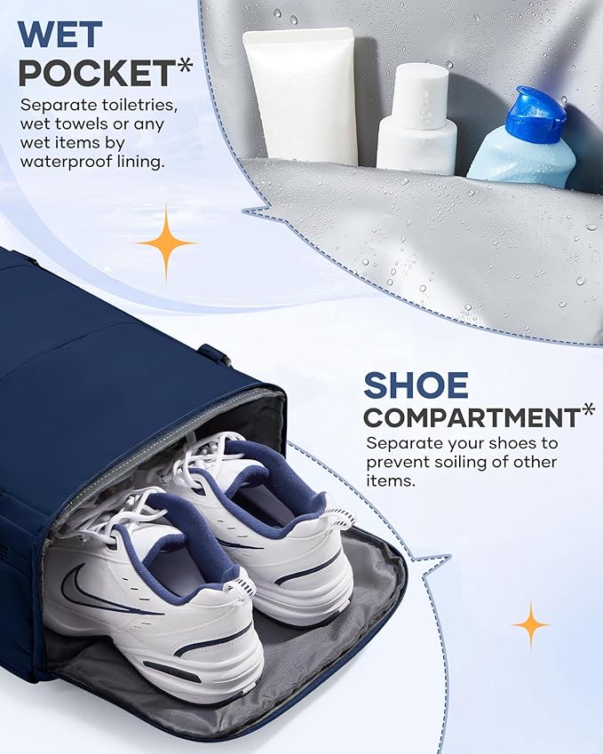 - 【SEPARATE SHOES COMPARTMENT AND WET POCKET】 The shoes compartment can hold a pair of slippers or low-top sneakers, allowing you to switch freely in different states of travel, business trips and outdoor sports; the wet pocket is made of high-density waterproof material, which can be used with to store wet items, making your stay in a hotel or apartment more convenient