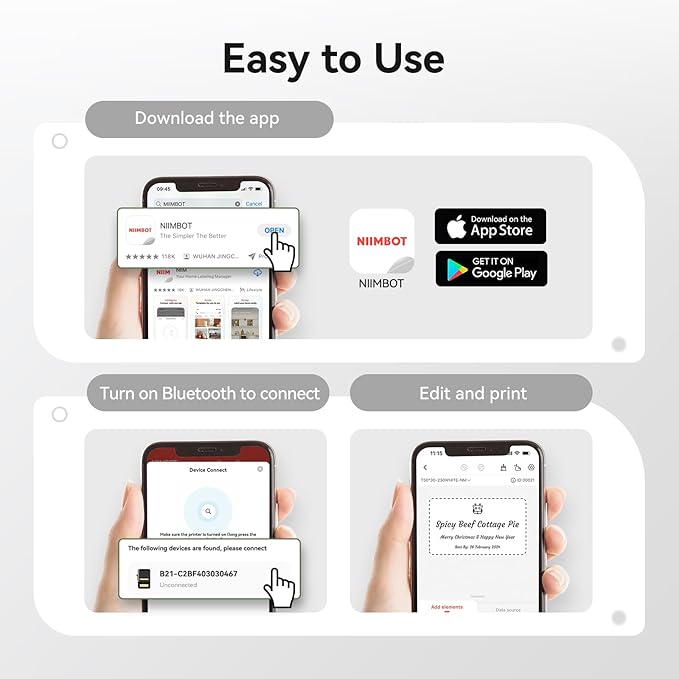 - Easy To Use: NIIMBOT label maker uses exclusive mobile APP to edit, please download the ''NIIMBOT'' APP from APP STORE or Google Play before printing. The APP provides a variety of free templates, allows you to import label text from Excel files, supports printing various texts, numbers, graphics, symbols, logos, barcodes, QR codes Label, etc. Customized your own label just in a second through your phone.
