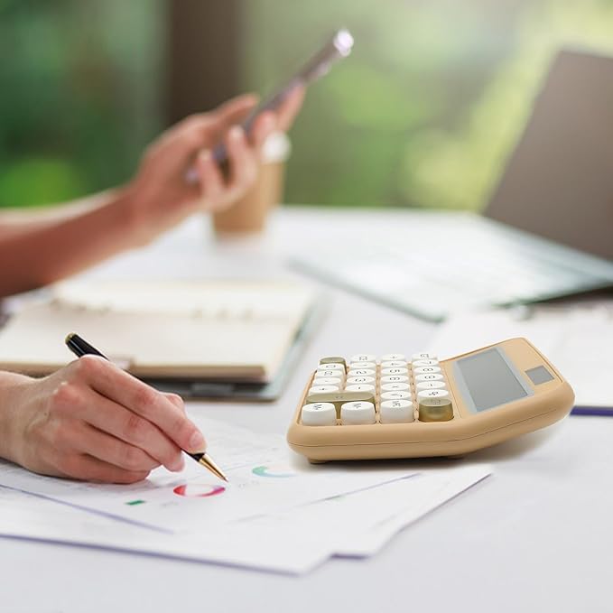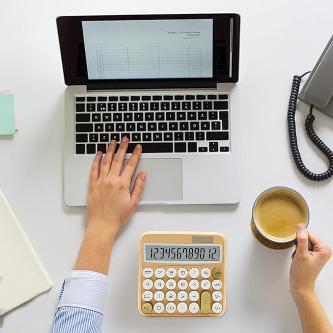 Beige Standard 12 Digit Calculator with Large LCD Display and Big Buttons - Cute Office, School, Home, Business Accessory