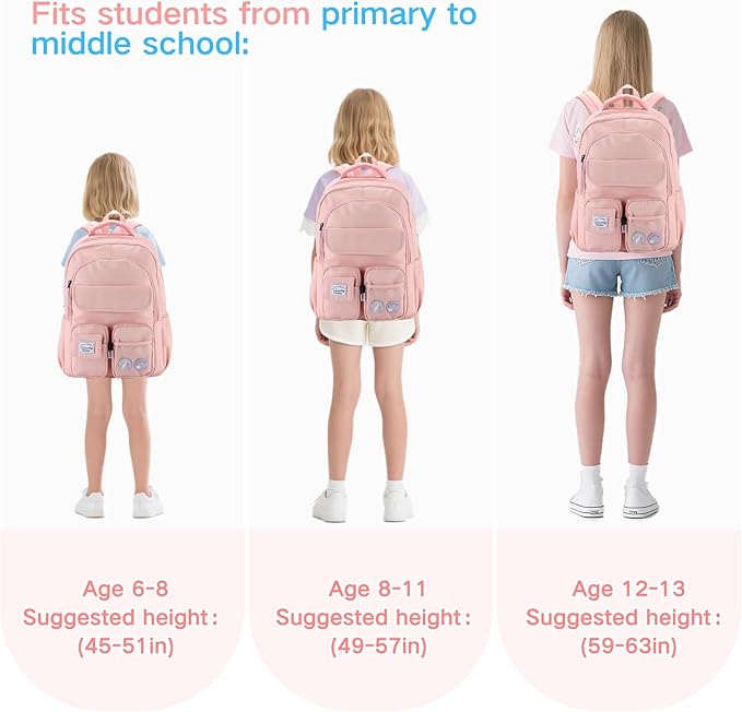 - 💗High-Quality and Durable: Made from water-resistant polyester with smooth zippers and reinforced stitching, this girls' school backpack is built to withstand daily wear and tear, offering long-lasting durability.