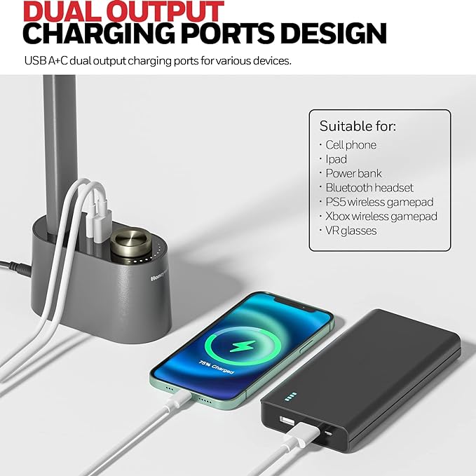 - 【DUAL OUTPUT CHARGING PORTS】H01 Pro USB desk lamp is equipped with both USB and Type-C dual output ports (5V/2.1A). This reading desk lamp is compatible with a wider range of devices, allowing efficient charging for two devices simultaneously without the need for additional charging adapters.