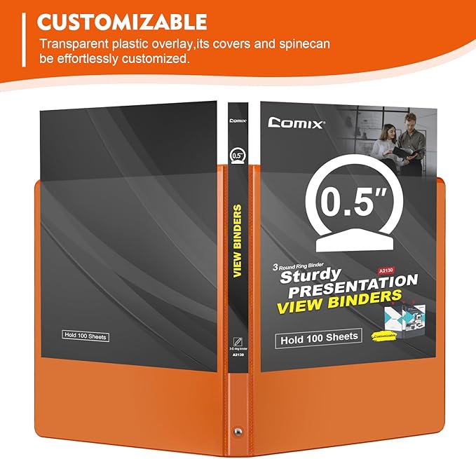 COMIX 3 Ring Binder 1/2 inch with Clear View Cover, 0.5" View Binder Holds 100 Sheets of US Letter Size Paper, 6 Pack (Orange)