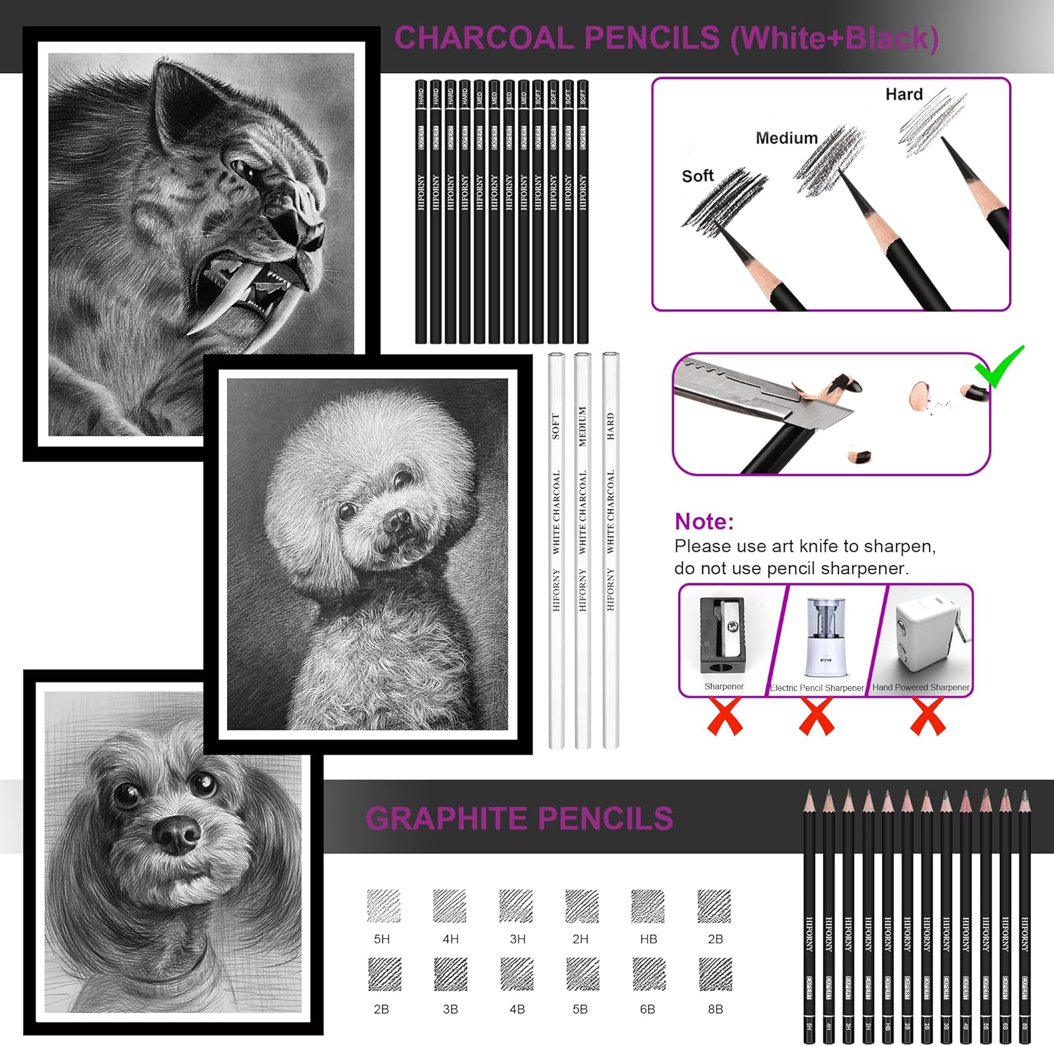 - 【Complete Drawing Supplies】HIFORNY 136 pack art set includes 9 types of professional drawing pencils.You can try various different drawing styles.These pencils include 12 charcoal pencils,12 graphite pencils,24 black edition colored pencils,24 watercolor pencils,12 metallic colored pencils,3 white charcoal pencils,2 woodless graphite pencils,1 colorless blender pencil,1 eraser pencil with brush.Each pencil is marked with name and model, perfect for drawing, sketching, coloring, layering, blending, and more.