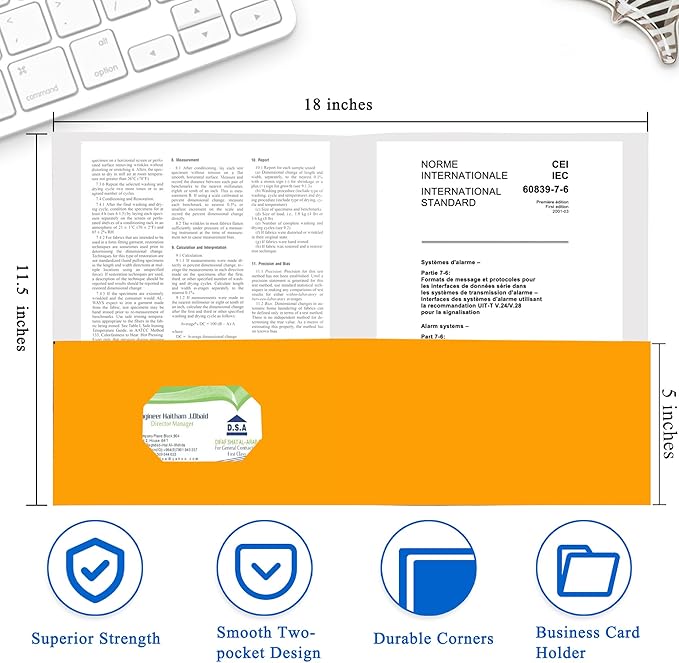 - Professional Design:Two pockets provide storage space for paper,brochures, and more,Each folders for documents measures 9" x 11.5",with two 5" pockets,holds (over 100) sheets of paper,and has a universal business card holder on the right pocket.