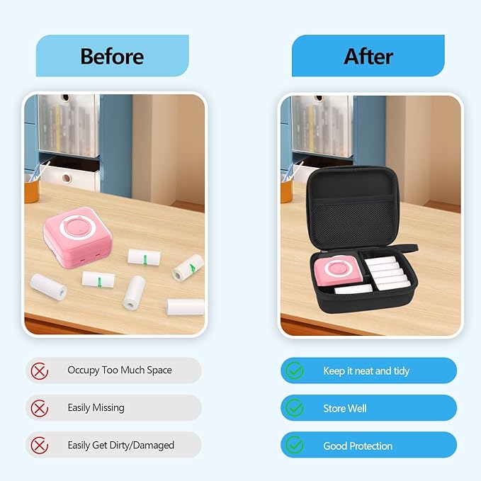 - Carrying Case for Organization and Protection --- The mini portable printer comes with a convenient carrying case, organize your print pods and hold your thermal papers up to 14 rolls, providing protection and easy transport for your printer, making it suitable for travel and mobile use.