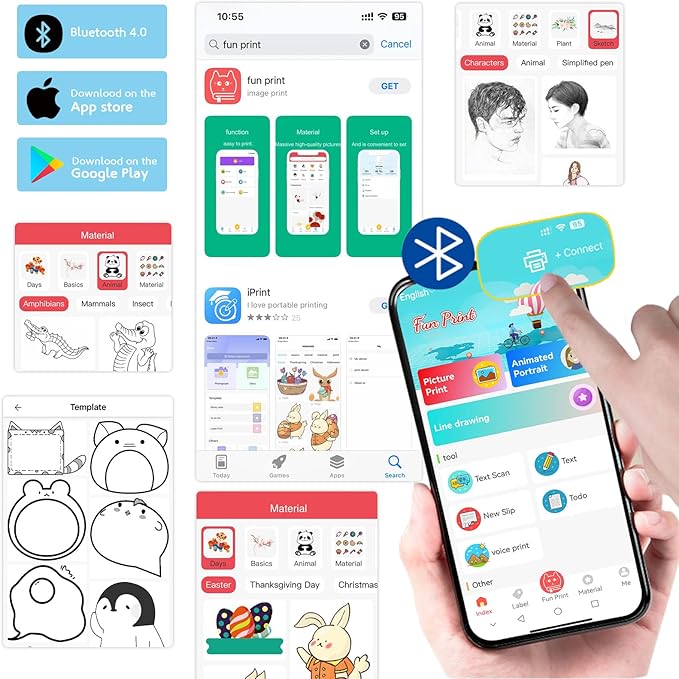 - Versatile Printing Options --- The mini printer for iPhone offers versatile printing options, allowing you to customize and print a wide range of stickers, journal entries, memos and photos. Multifunctional Print App “funprint’ has many templates, such as Easter, Halloween, Christmas and other templates, very versatile to meet your diverse needs.