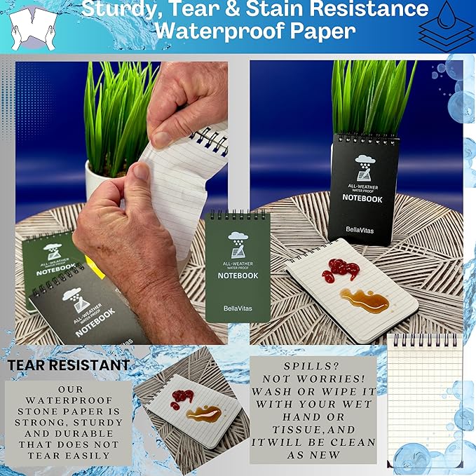 - RELIABLE WATERPROOF DESIGN: This Bellavitas waterproof notebook ensures your notes remain intact even in wet conditions, making it perfect for outdoor use and all-weather note-taking scenarios.