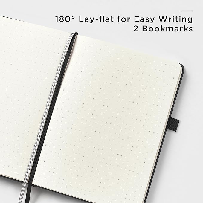 - 180° LAY-FLAT DESIGN: The lay-flat design allows for easy writing and ensures that you can utilize every page efficiently. Journaling, note-taking and planning has never been easier! 2 Bookmarks to help you find important content faster!