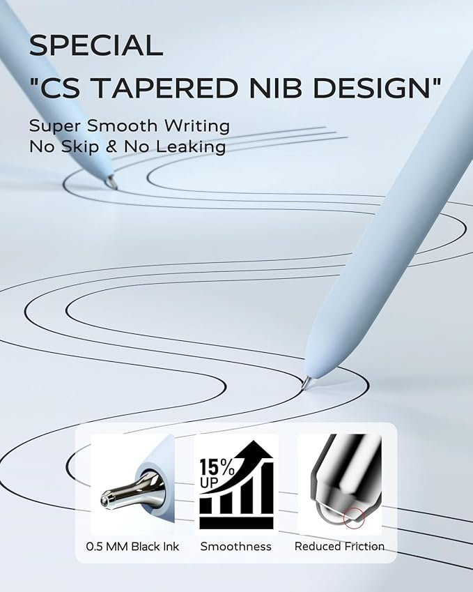 - [ 0.5mm Quick-Drying Ink: ] These retractable roller ball gel pens feature reliable ink with fade-resistant ink or there’s no need to worry about getting ink on your hands or desk, as it won’t fade, bleed, or smudge; the rollerball ink dries quickly that help you keep work neat and organized.Note: After using the gel pen, it is suggested to lay the pen flat or the nib face up. This helps protect the pen tip.