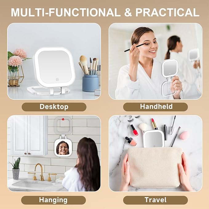 - 💄【Double Sided - 1x/10x Magnifying】:This 1X LED bright flat mirror is perfect for checking the overall makeup, simulating daylight, bright but not dazzling. And the 10x Magnifying is for more makeup details. Keep the mirror 2-3 inches away from your face when using the 10X magnifying mirror to the best results and prevent dizzy. Suitable for applying mascara, lipstick, removing blackheads/blemishes and wearing contact lenses.