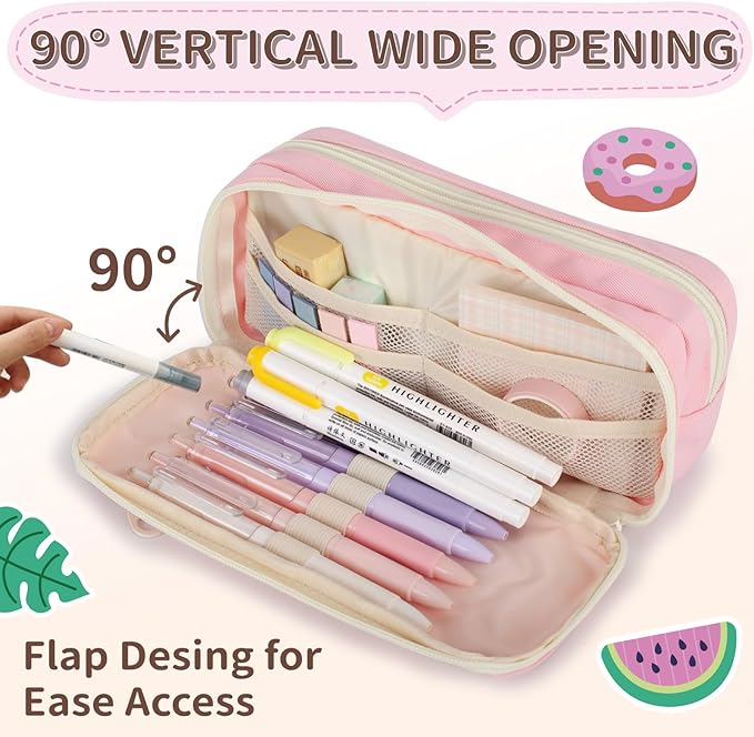 • 【Upgraded 5 Compartments】Measuring 8.5" x 2.8" x 3.8", this roomy pencil pouch can hold up to 100 pens, pencils, art markers, dual brush pens, and highlighters. With 5 compartments, the cute pencil bag offers excellent hierarchical storage for scissors, sticky notes, calculators, rulers, staplers, and tape, ensuring everything stays neatly organized and easily accessible.