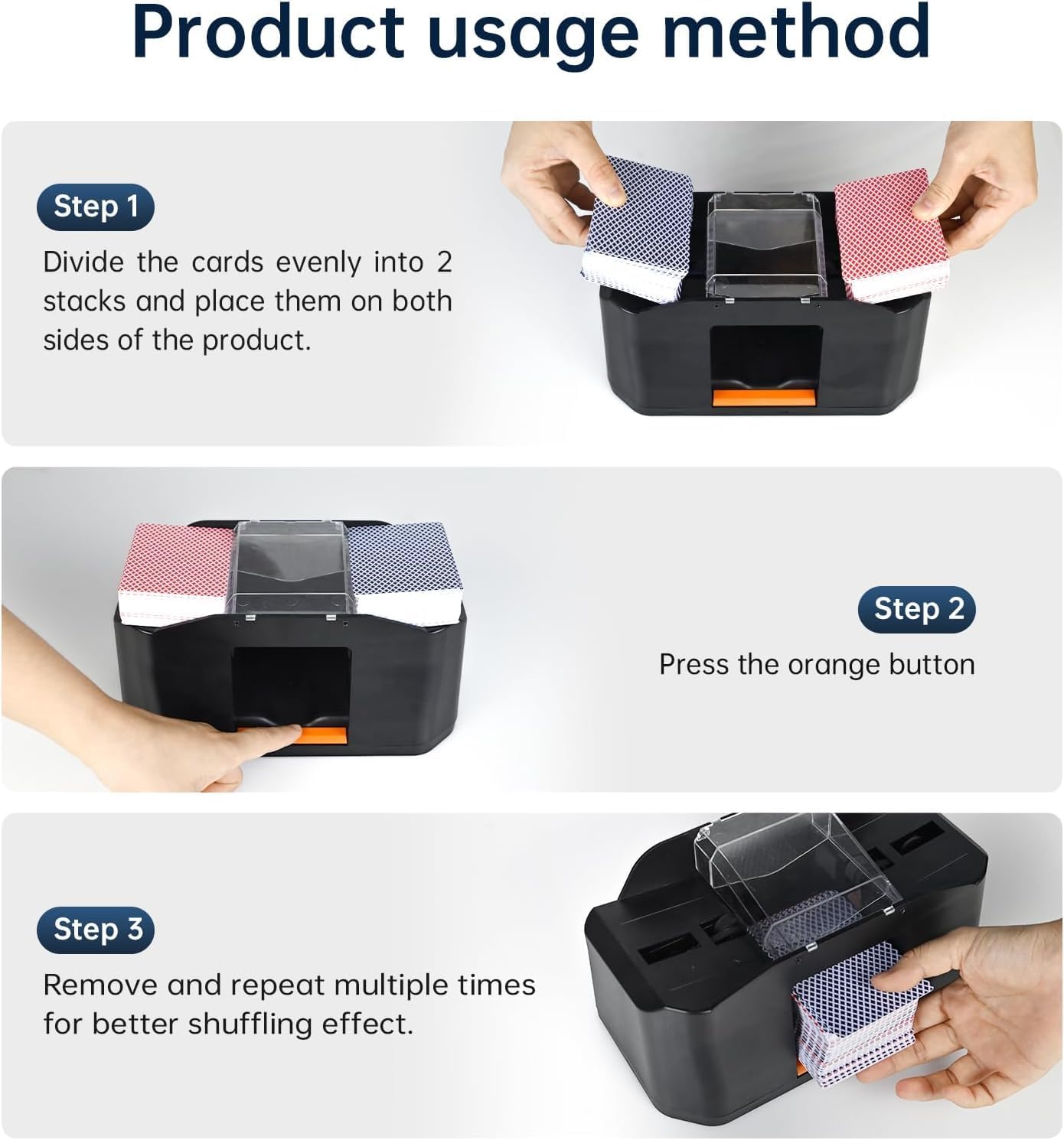 - 【High-Speed Low Noise Motor】 The card shuffler features a new high-efficiency low noise motor, operating at 10,000 RPM, With a powerful belt-driven system, it runs more stably and quietly, capable of shuffling 2 decks in just 2 seconds. This ensures less disruption and more enjoyment for card game enthusiasts!
