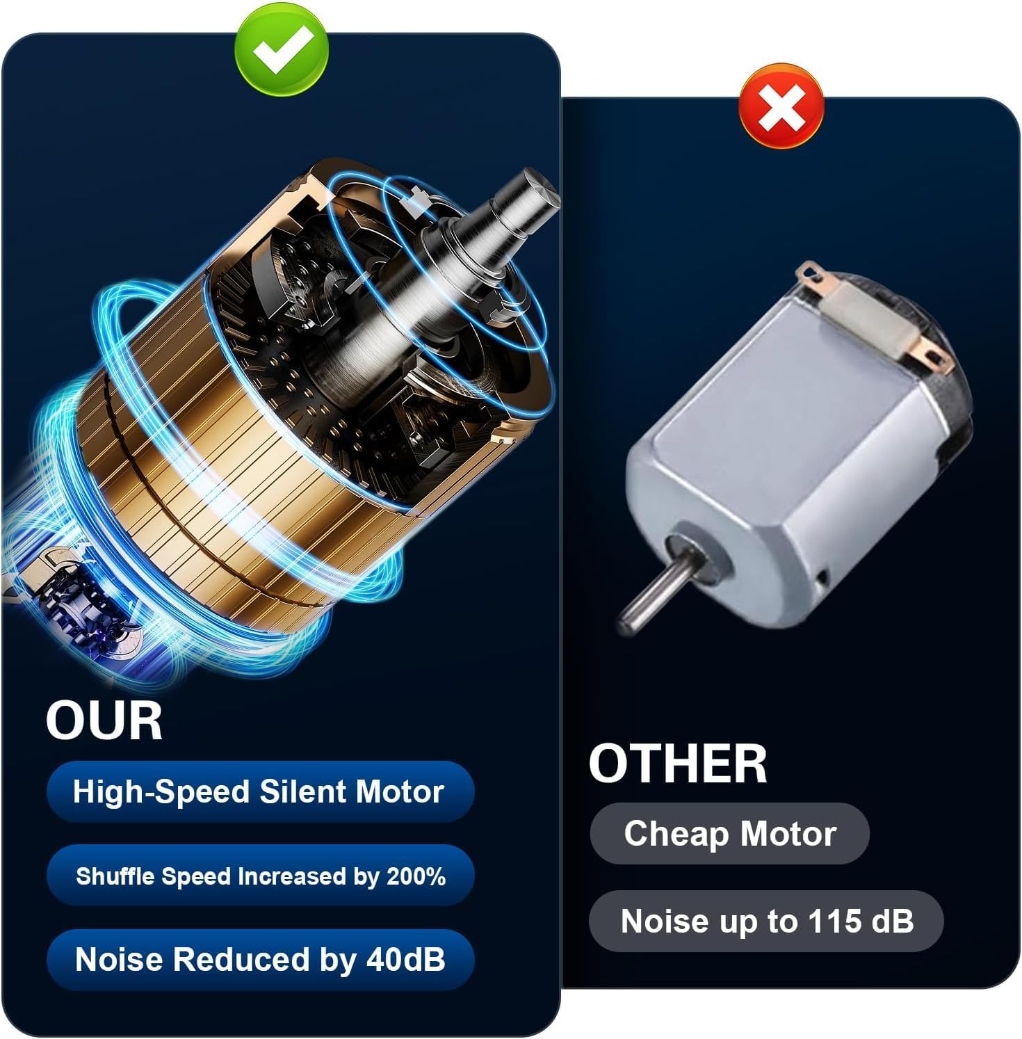 - 【40% Reduction in Noise with Enhanced Cushion Design】Our electronic card shuffler boasts a high-quality motor and integrated sound-absorbing cushion made from durable, resilient materials. This innovative design significantly reduces noise, improves shuffle smoothness, and minimizes card jamming. Ensuring rapid, seamless, uniform, and precise shuffling, it's the ultimate choice for card game