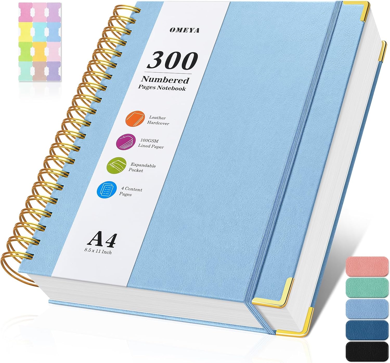 Spiral Notebook 8.5" x 11", 300 Numbered Pages Notebooks College Ruled with Tabs, Hardcover Leather Lined Journal for Women Men, 100GSM Thick Journals for Writing, Large A4 Notebooks for Work School
