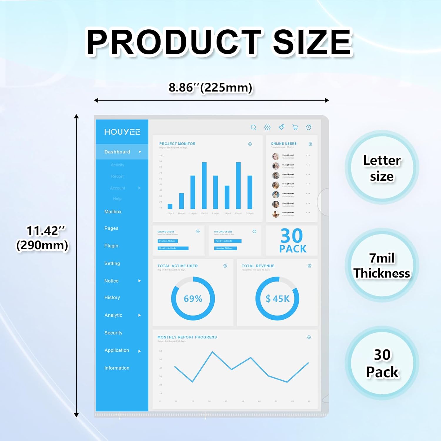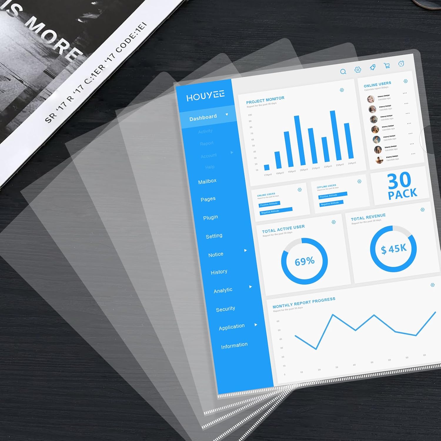 HOUYEE 30 Pack Heavy Duty Clear Document Folder, Plastic Paper Sleeve Fit for Letter Size Paper, for Home, Office, and School Use