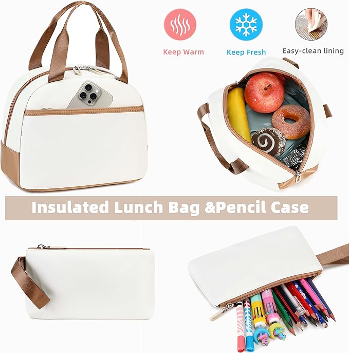 - Multi-pockets & Large Capacity Back packs: The students book bag has 6 separate different size zipper pockets with many compartments and two side pockets meet your daily storage.Main roomy compartment can easily hold a 15.6" laptop, textbooks, magazines, college supplies, travel clothes, phone charger, etc . The reusable insulated lunch bag can hold up to 9.5 liters or 15 cans (330 ml) of drinks, and the pen bag is convenient for storing keys, cards, cell phone, utensils and other small items