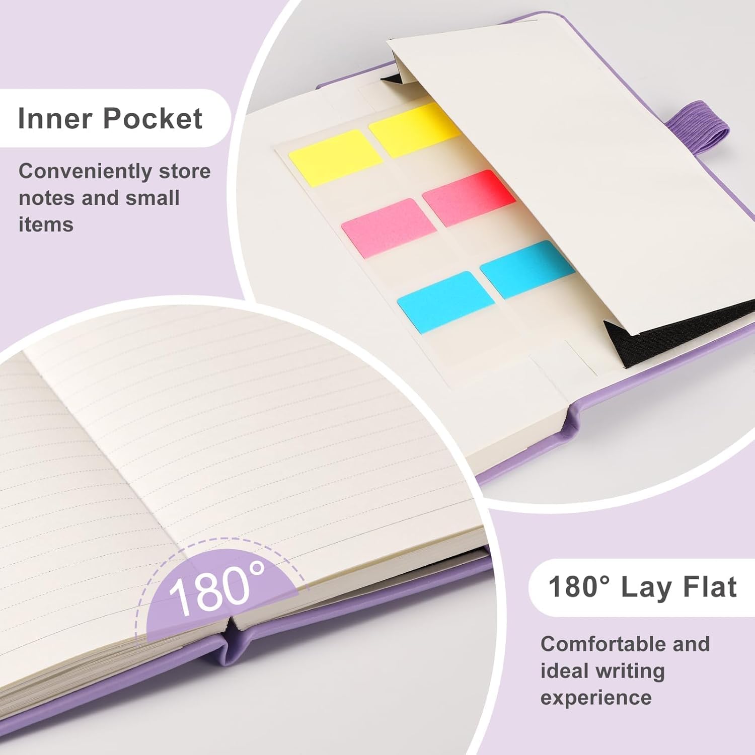 - Built to Last: Stylish light purple hardcover with PU leather and sun-embossed pattern ensures scratch resistance, while the reinforced binding keeps pages intact even with frequent use. The 180° lay-flat design makes writing comfortable anywhere