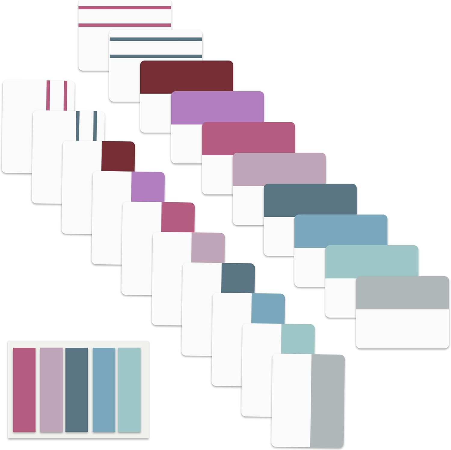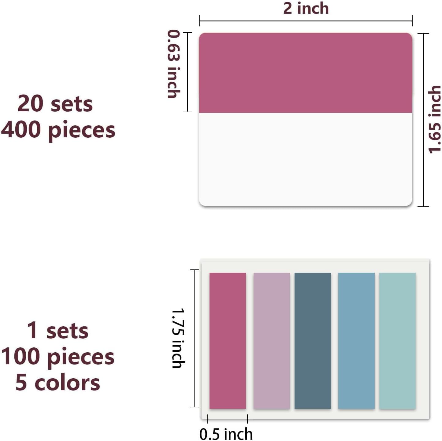- Package Contents: 500 pieces 21 sets in total, 400 pieces 2 inch sticky tabs in 20 sets with 10 different pastle colors,100 pieces 0.5 in tabs in 1sets, 20 pieces each color