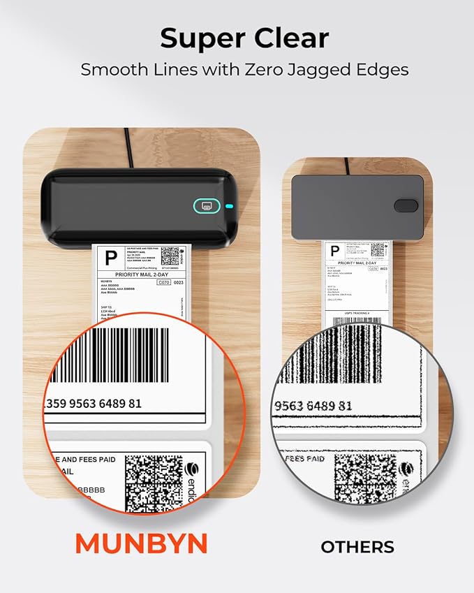 - Save on Long-Term Costs: The Munbyn RW402B thermal shipping label printer helps you smartly reduce long-term expenses. With MicroJam Technology, jams occur less than 0.01% of the time, boosting productivity and decreasing waste from error printing. This technology ensures consistent printing, so your multitasking encounters fewer unexpected interruptions