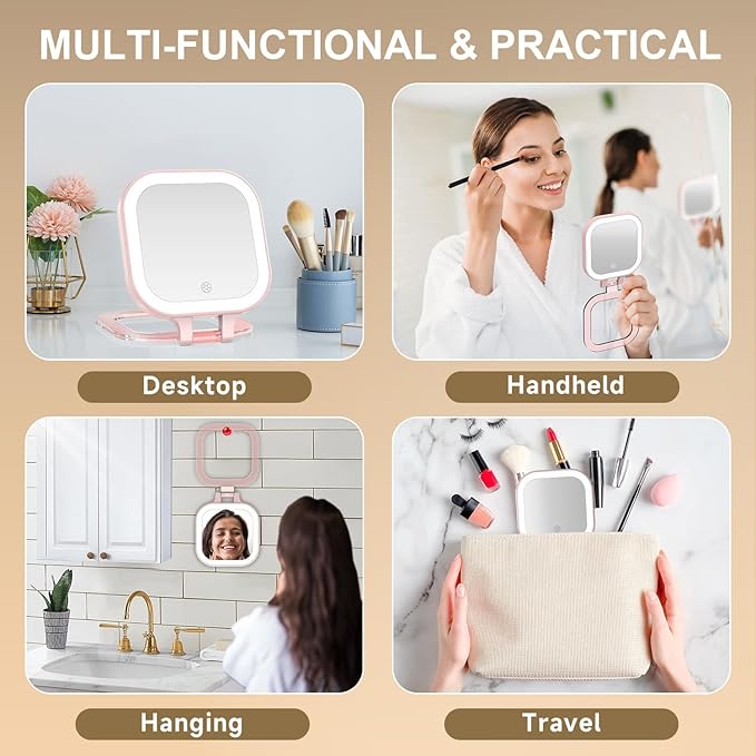 Mocado Compact Travel Makeup Mirror, 1X/30X Magnifying Mirror with Light, Double Sides Compact Mirror with 3 Color Light, Dimmable Handheld Mirror, Rechargeable Travel for Purse,Pocket(Pink)