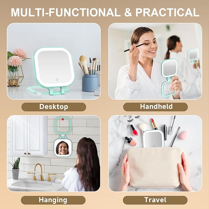 Mocado Compact Travel Makeup Mirror, 1X/30X Magnifying Mirror with Light, Double Sides Compact Mirror with 3 Color Light, Dimmable Handheld Mirror, Rechargeable Travel for Purse,Pocket(Green)