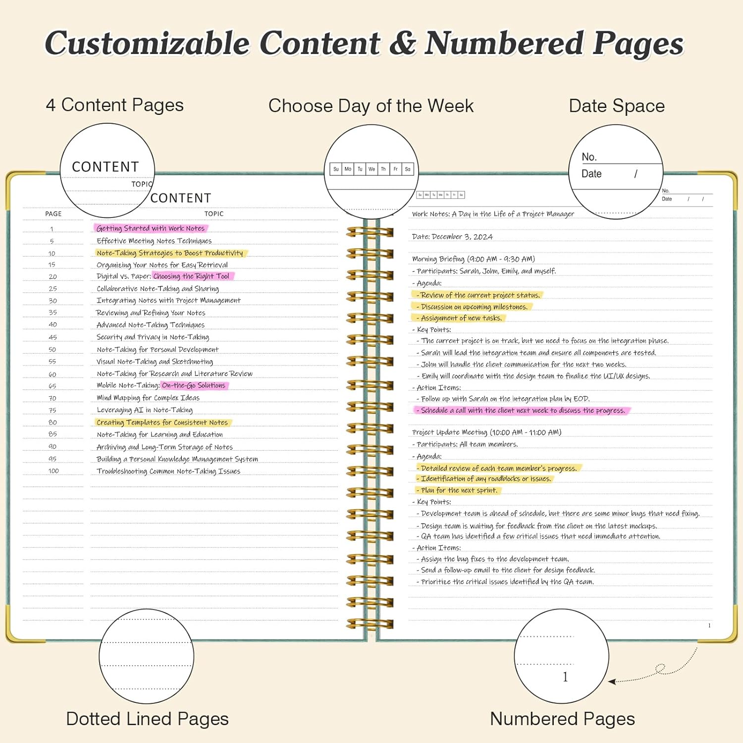- 【300 Numbered Pages with 4 Contents】Thick journal features a total of 304 pages, with 300 numbered pages and 4 dedicated contents pages . This section allows you to easily reference important notes or sections by marking them upfront for quick and organized access. Each page includes a double-sided header where you can specify the day of the week and enter the date with the format "No. ___ Date ___," making organized note-taking effortless. Ideal for keeping track of tasks and events.