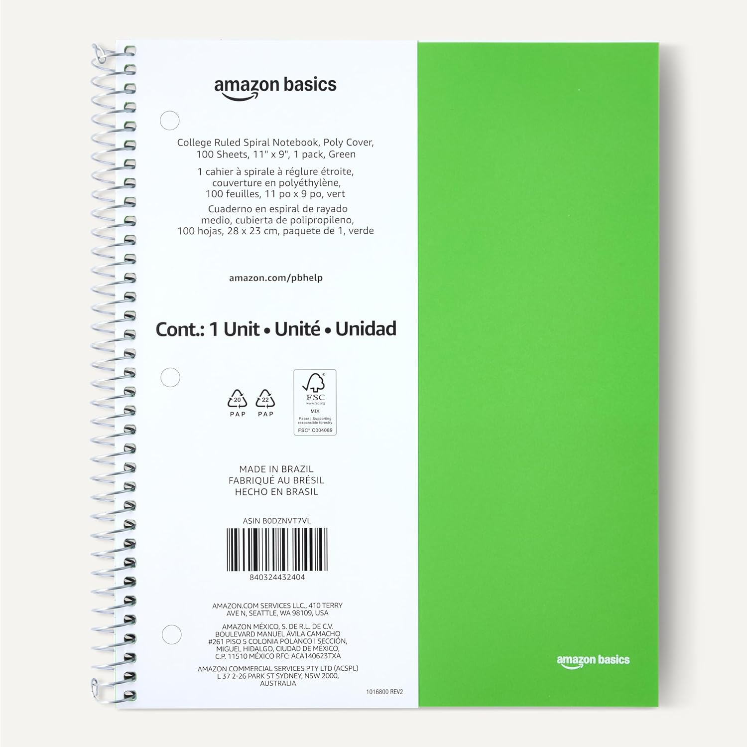 Amazon Basics College Ruled Spiral Notebook, Poly Cover, 100 Sheets, 11" x 9", Green, 1 pack