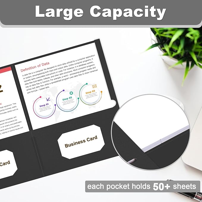 - Large Capacity: 30 pack pocket folder has two deep pockets that hold over 50 sheets of paper each. 2 business card slots for instant access to important contacts without the need for a separate business card holder.