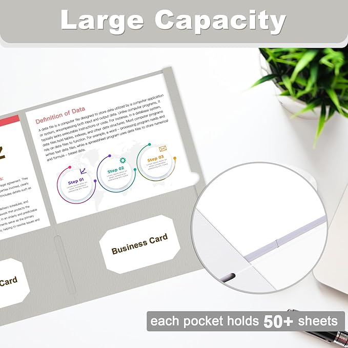 - Large Capacity: 30 pack pocket folder has two deep pockets that hold over 50 sheets of paper each. 2 business card slots for instant access to important contacts without the need for a separate business card holder.