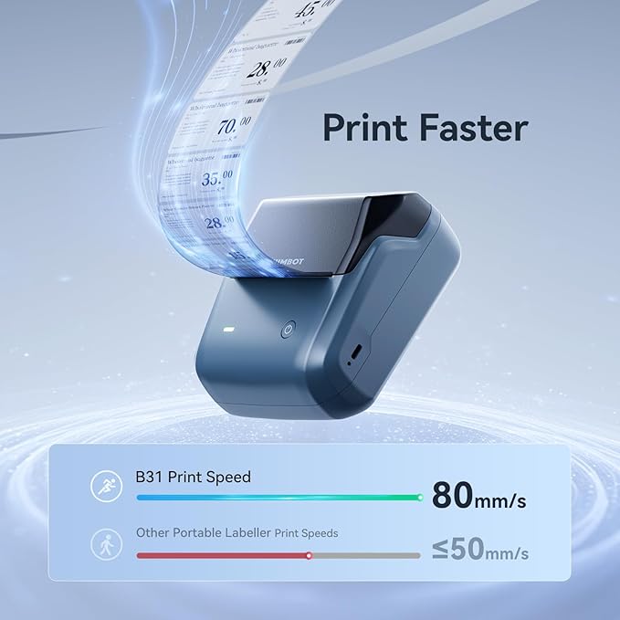 - 【Printer Faster & Wider】Equipped with thermal technology, you can enjoy high-definition without relying on ink or toner. NIIMBOT B31 sticker label maker support from 0.78'' -3'' width thermal label, support more wider sizes label. Printing speed of 80 mm/s, up to 60 sheets 50x50 labels/min. High speed brings high efficiency and helps your business grow faster! (Attention: This label printer can't print 4 x 6 shipping labels)