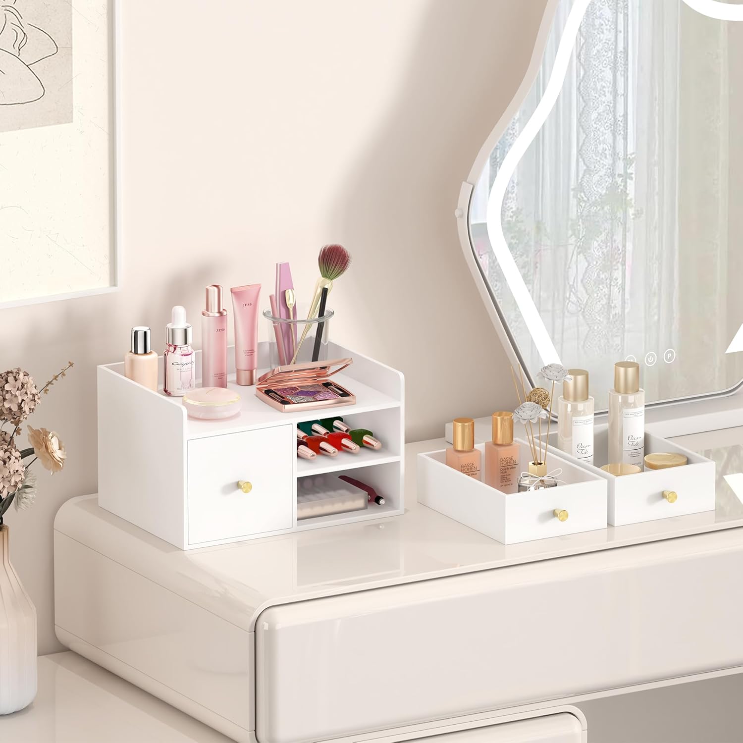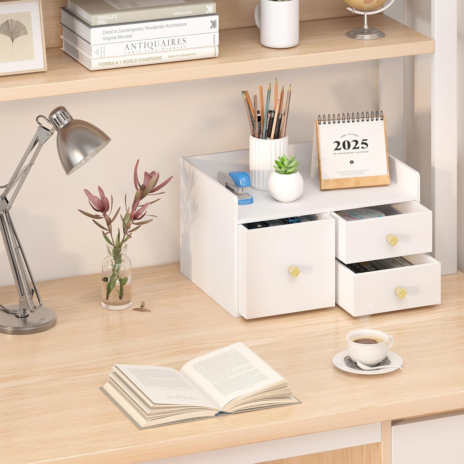 - Versatile Desk Organizer with Multiple Compartments: Designed with various compartments and drawers, this desk organizer helps you efficiently organize stationery, cosmetics, or small items, keeping your desk clutter-free.