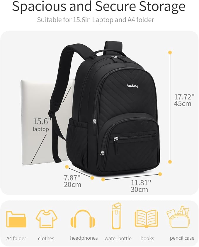- Spacious Interior: Providing ample space for your essentials. Simple & convenient design, 15.6" laptop sleeve, 1 main compartment for A4 folders, work documents, books and lunch box, middle pocket with additional mesh sleeves to keep your accessories organized and on hand, 2 side pockets and a back anti-theft pocket. Whether your carrying textbooks, tech gadgets, or travel essentials everything has its place within this versatile pack