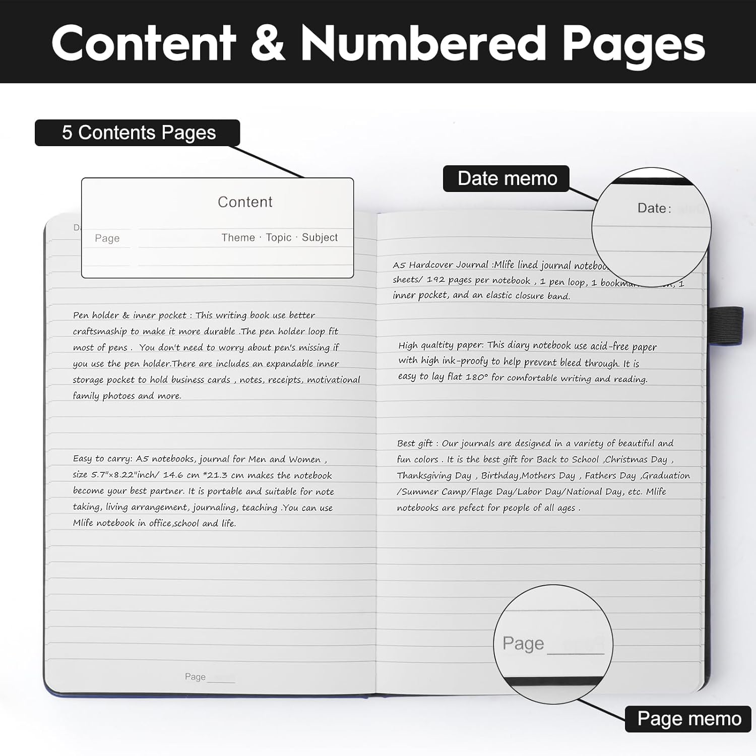 - 【Humanized Design】5 Contents Pages for detailed indexing. No more worrying about not having enough index pages; 1 Exquisite ribbon bookmarks to mark your place effortlessly; 1 Elastic closure band to keep your pages safe; 1 pen holder for convenient storage.; 1 Back Inner pocket for storing notes, receipts, or small items.