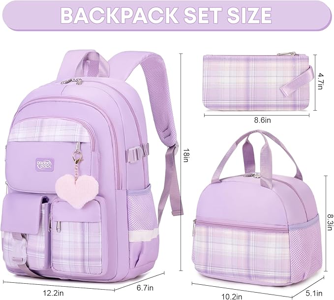 3PCS School Backpack For Student Women College Middle High Teen Girls Bookbag Waterproof Laptop Bag Plaid Purple