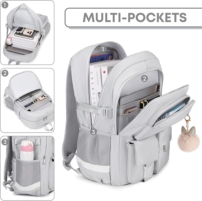 - The backpack for school has 5 separate different size pockets and two side pockets meet daily storage. The front three pockets can hold charge device and other small items, convenient for your daily organization. The main pocket of includes laptop padded sleeve with elastic belt and hidden inner zipper pockets. The front tool pockets also come with multiple compartments to provide roomy space for necessities
