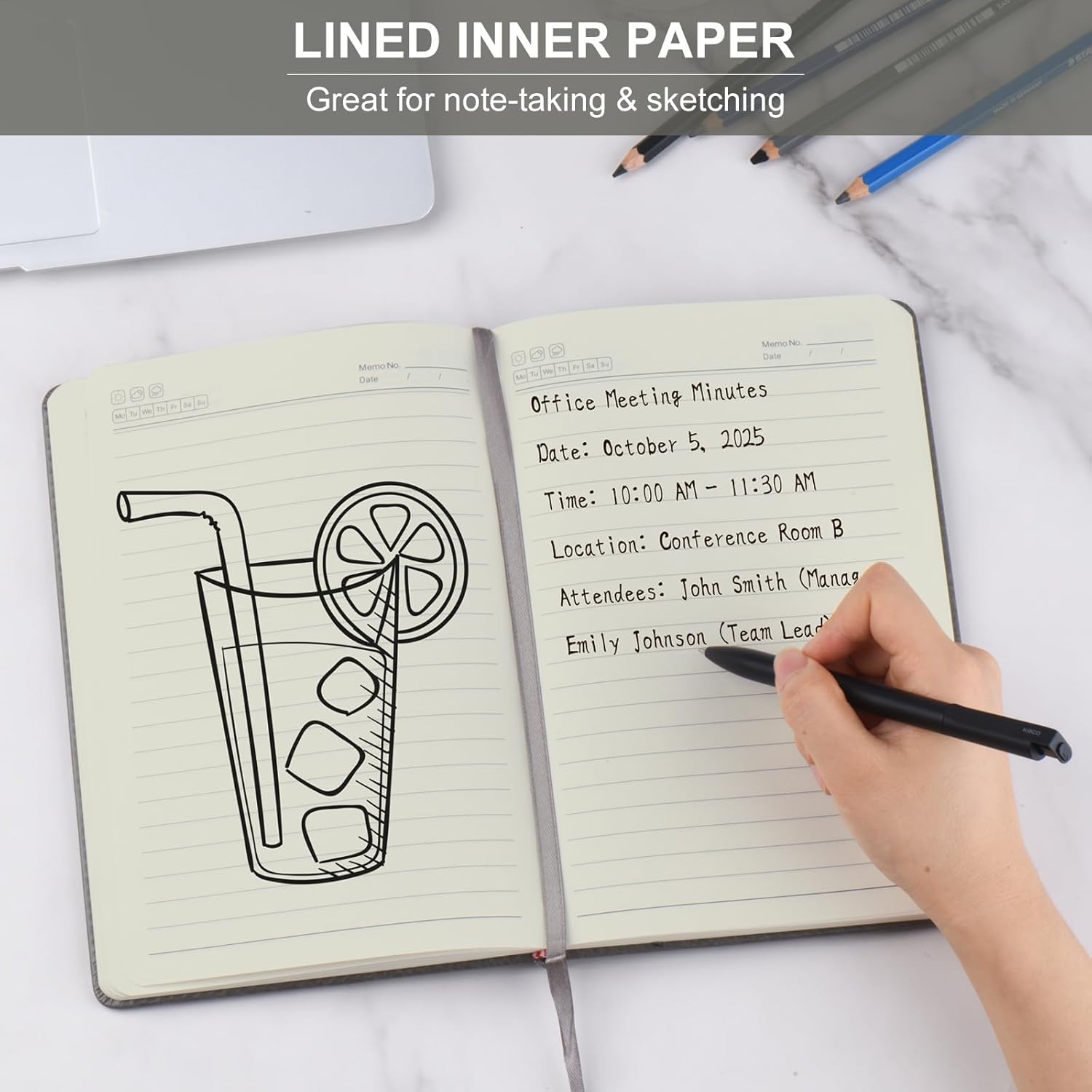 - 192 Pages Lined Journal Notebooks: 6 grey hardcover notebook, ,192 pages/96 sheets per notebook (1152 pages/ 576 sheets in total), adequate for work, meeting, studying. The paper of the leather notebook is thick enough that ink won't bleed through. The light yellow paper is more eyes comforting, release eyes burden when writing. It is the ideal notebook for work, school, meeting, travel and dairy.