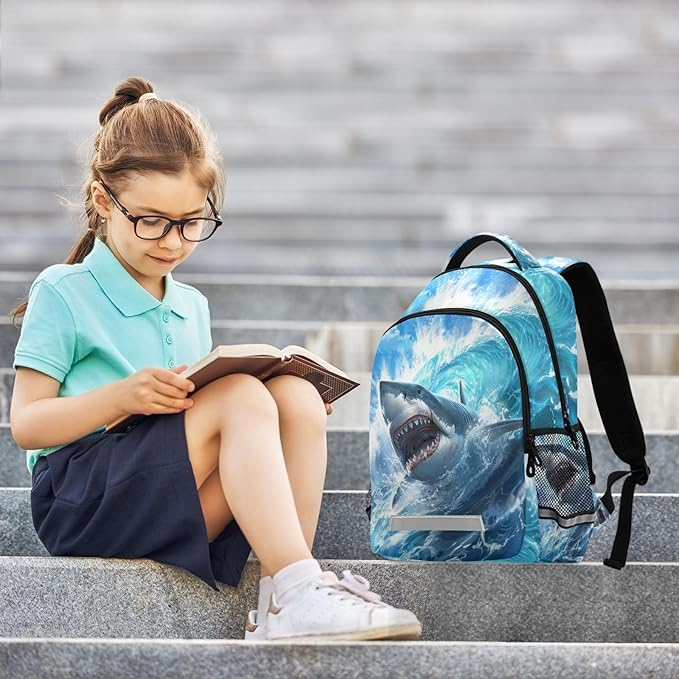 Shark Blue Ocean Wave Backpack for Boys Girls Elementary School Bag Kids Bookbag Travel Rucksack