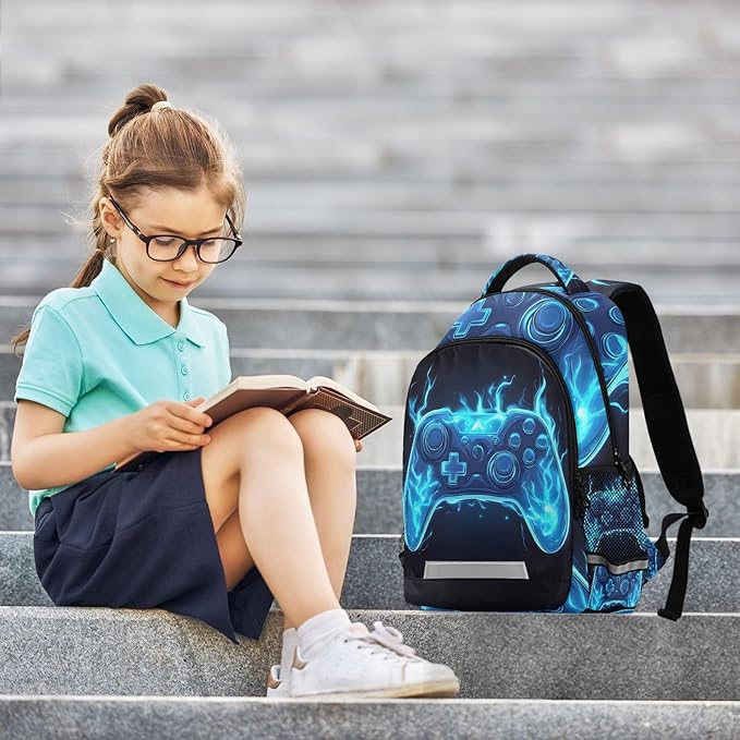 Joystick Video Game Blue Flame Backpack for Boys Girls Elementary School Bag Kids Bookbag Travel Rucksack