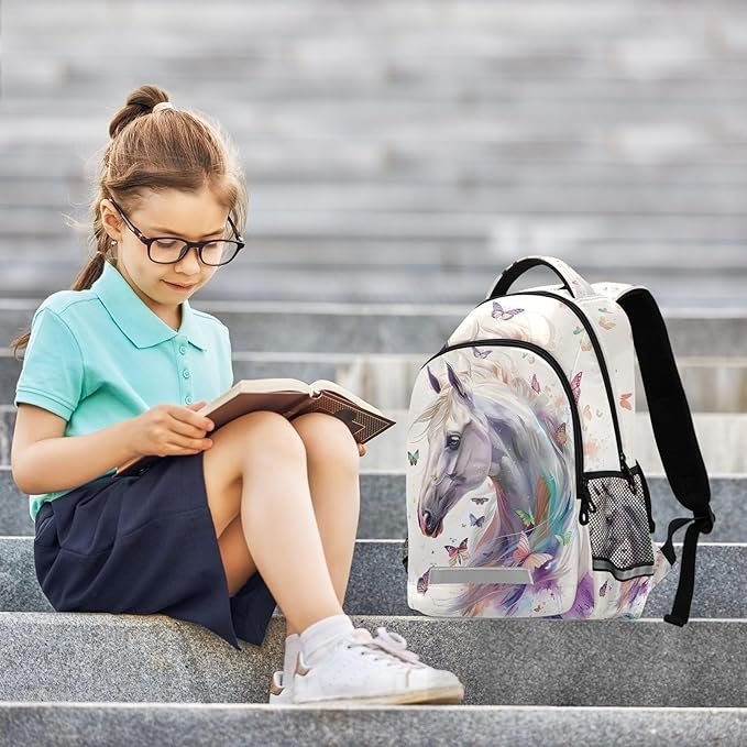 White Horse Butterfly Backpack for Girls Boys Elementary School Bag Kids Bookbag Travel Rucksack