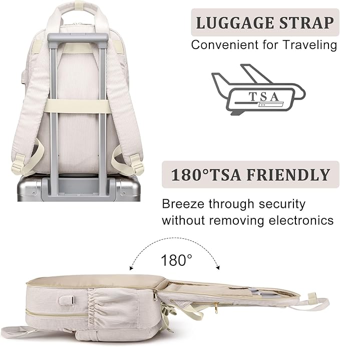 School Backpack for Girls Laptop Bookbag: Casual Corduroy Women Backpacks with USB Charging Port TSA Friendly Travel Back Pack with Anti-Theft Pockets Cute College Daypack for Teen Students Lady Beige