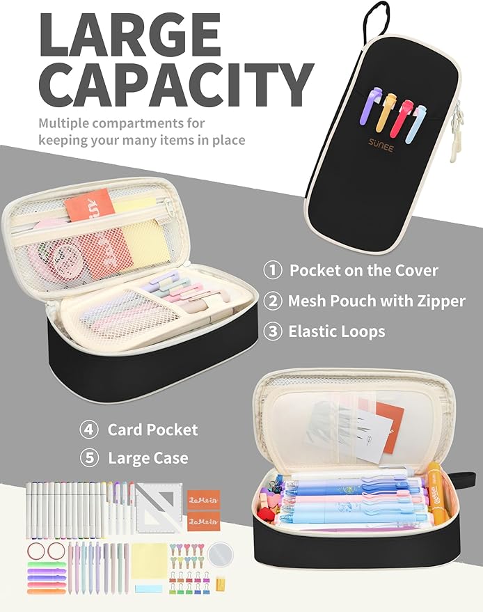 SUNEE Large Pencil Case, Cute Pen Pouch, Aesthetic Zipper Stationery Bag Large Capacity Kawaii Pen Organizer, Black, Bag Organiser