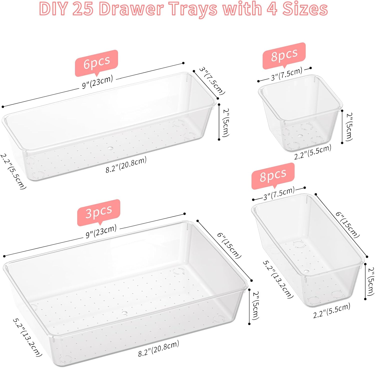 - Multi-size Combination: There are 25 pcs drawer organizer trays in 4 sizes, which are suitable for most drawers. It can also be DIY trays to arrange to meet different storage needs. Includes: 9 x 6 x 2 inches (3pcs), 9 x 3 x 2 inches (6pcs), 6 x 3 x 2 inches (8pcs), 3 x 3 x 2 inches (8pcs)