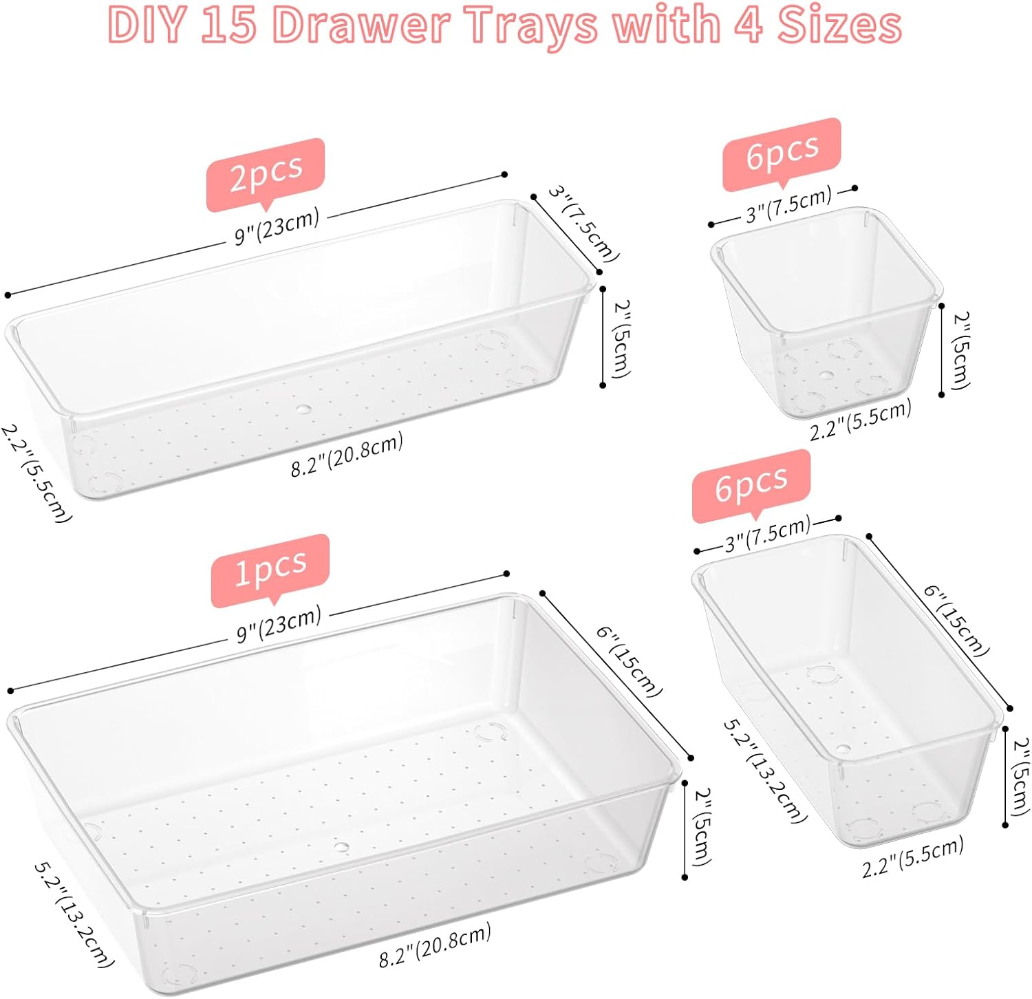 - Multi-size combination: These divider bins contains 15 pcs trays in 4 sizes, which are suitable for most drawers. It can also be DIY trays to arrange to meet different storage needs. Includes: 9 x 6 x 2 inches (1pcs), 9 x 3 x 2 inches (2pcs), 6 x 3 x 2 inches (6pcs), 3 x 3 x 2 inches (6pcs)