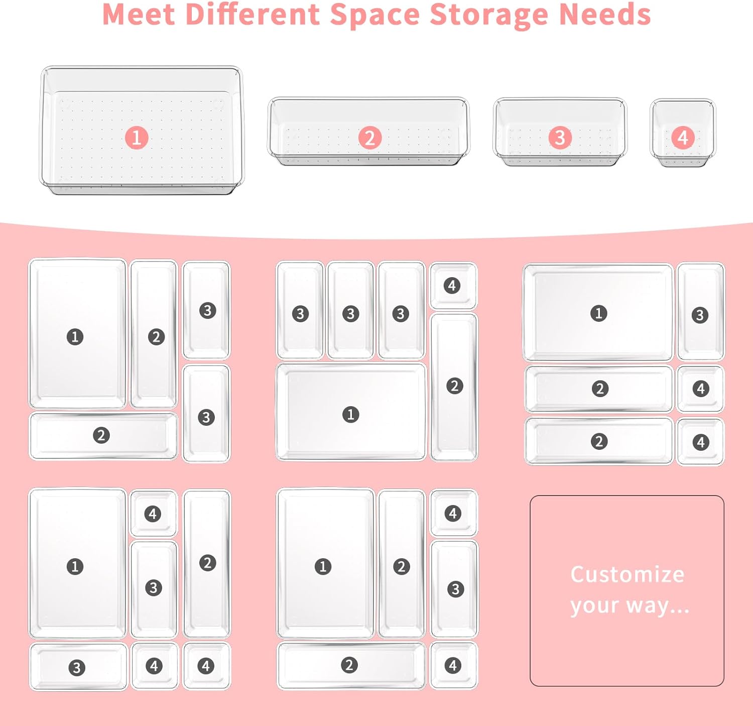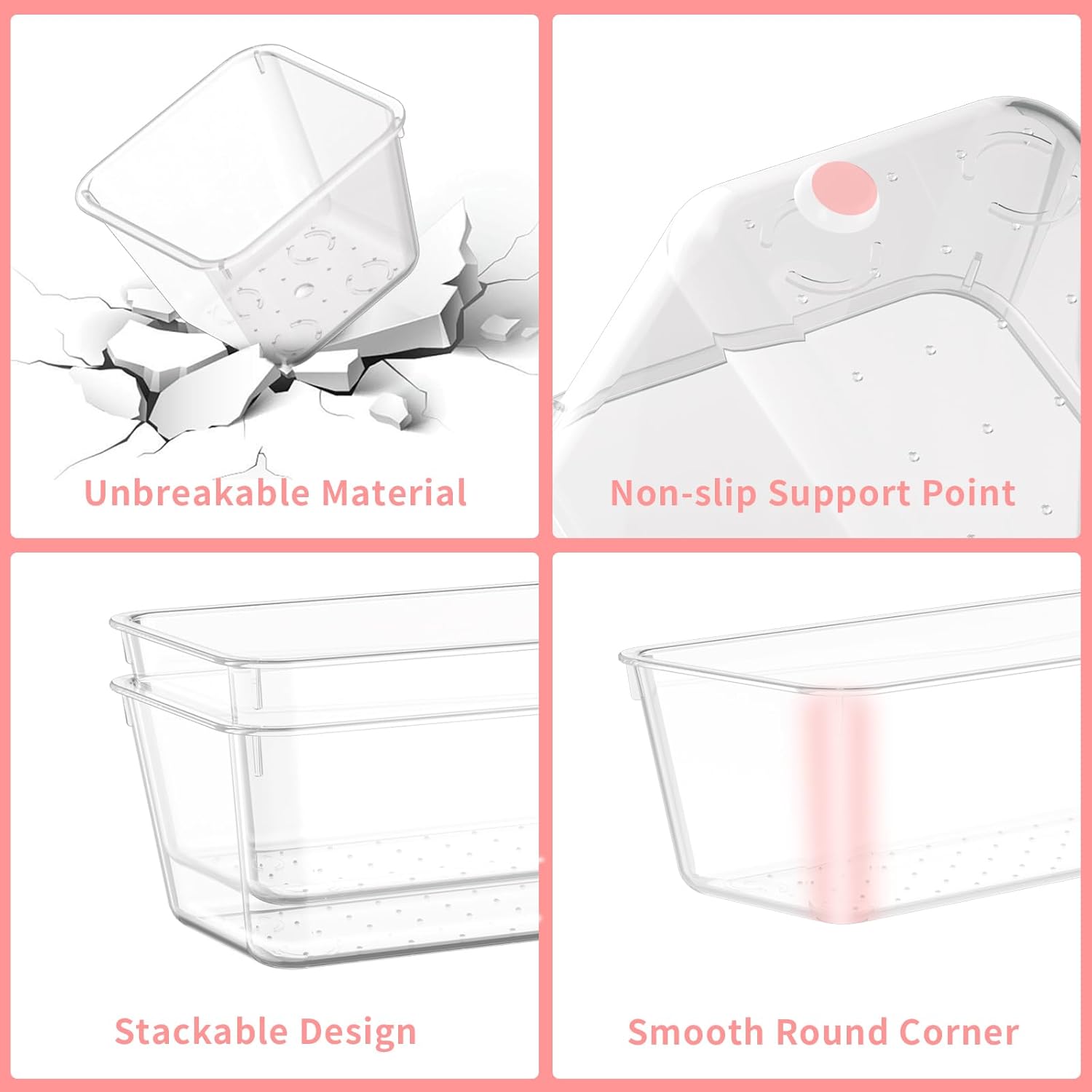 - Stackable & Non-Slip Design: This plastic containers for drawer can be stackable flexibly when not in use to save space. In addition, it is equipped with 60pcs silicone pads that can be pasted on the bottom to prevent the organizer tray from moving around when the drawer is opened or closed