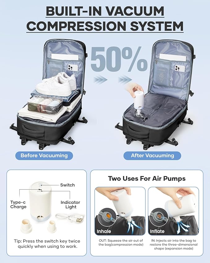 coofay Vacuum Backpack Travel with Pump Vacpack Travel Backpack with Vacuum System Compression Backpacks