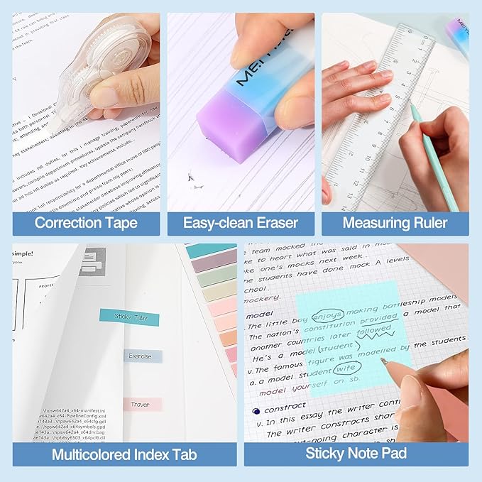 - Complete Stationery Set: MoKo 56-piece stationery set is an all-in-one solution for writing, highlighting, and correcting, perfect for students and professionals. These school supplies include 12 gel pens (6 black pens, 6 colored pens), 12 highlighters, 6 mechanical pencils, 10 gel pen refills, 2 sets of pencil leads, 2 rulers, 2 correction tapes, 4 erasers, 4 sticky note pads, 1 set of multicolored index tabs, and 1 large-capacity pencil pouch.