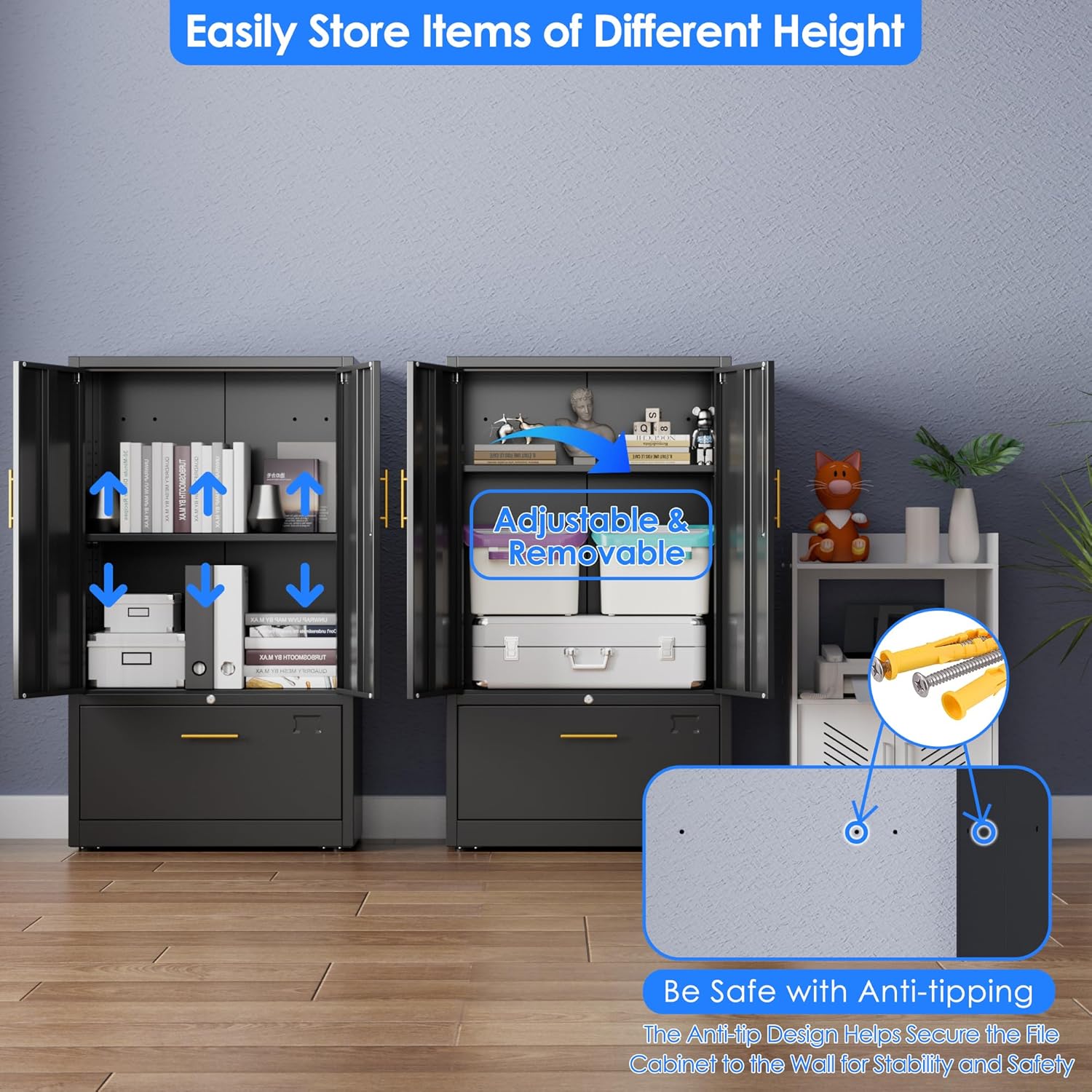 - Novel and Upgraded Design for Versatile Storage: The lateral file cabinet combines a robust metal storage cabinet with adjustable shelf to accommodate items of varying heights, along with one lateral drawers featuring 2 adjustable hanging bars for seamless organization of A4, Letter, or Legal-size folders. This innovative design optimizes space and flexibility for home, office, garage, or school use;