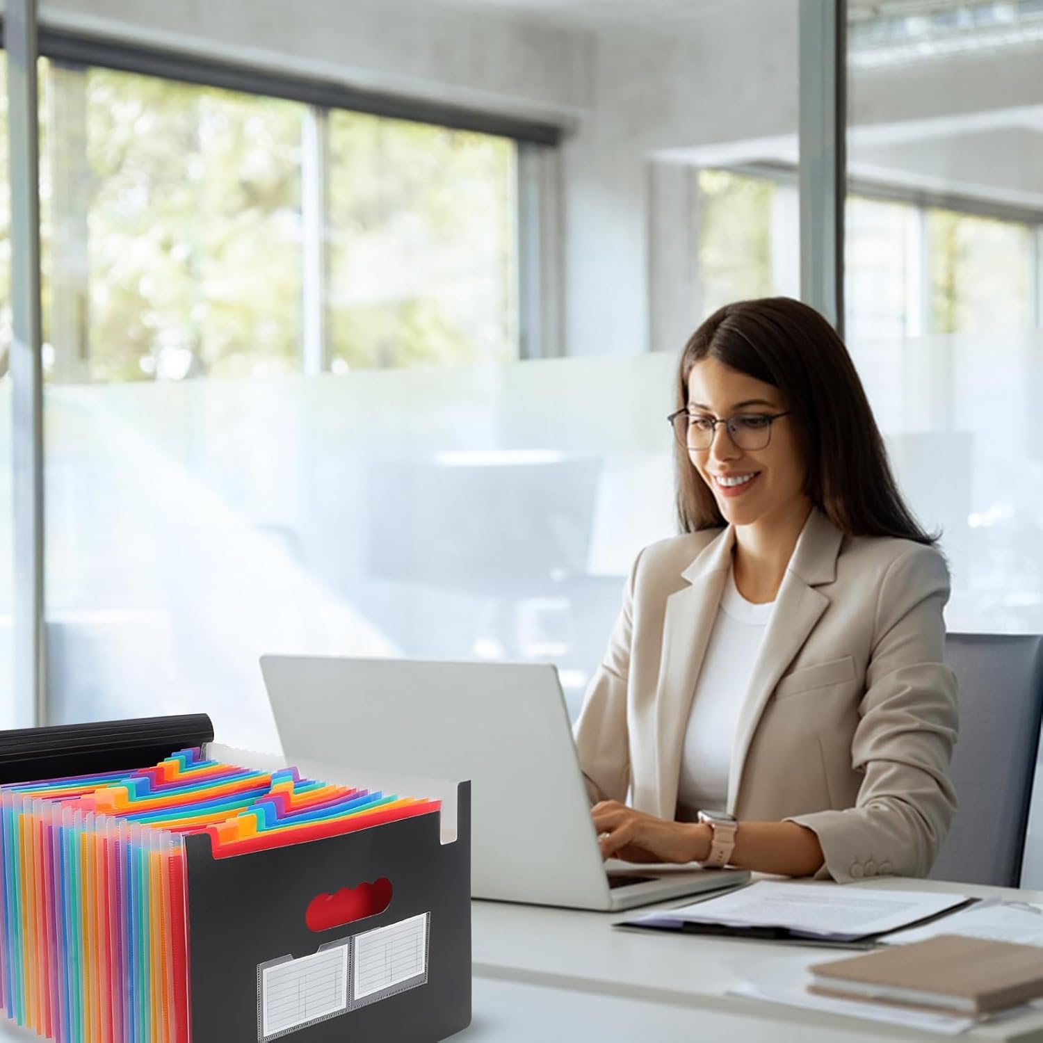 - Portable and Stylish:Our folders with pockets feature a rainbow-colored design, which is stylish and beautiful. The lightweight file box can be compressed to a minimum thickness of 1.5”, and can be easily stored in a filing cabinet when closed. Handles on both sides enable easy gripping and carrying, making it ideal for transport between workplaces